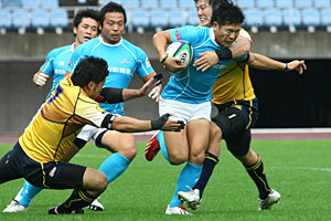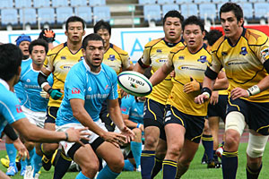 ![]() ![]() NTTコミュニケーションズシャイニングアークス 28-26 豊田自動織機シャトルズ ファーストステージ・第3節 プールA 台風18号が接近、大粒の雨が止まず開催も心配されたが、キックオフ前には小降りとなった宮城スタジアム。けして良くはないピッチコンディションでの第3節。これまでの2試合は両チームとも落としており互いに負けられない一戦となった。 序盤は、滑るボールを意識してかキックゲームの様相。風上の豊田自動織機が相手陣内に攻め込みゴール前での攻防となった。 17分にはNTTコミュニケーションズがすぐに追いついた。相手陣左ラインアウトから右へ展開、22m付近中央にてペナルティを得るが、クイックスタート、左右に持ち出しながらラックを連取。ディフェンスを内側へ寄せたところで、BKへ展開しWTB友井川が左隅にトライを決めた。難しい角度のゴールをSO川本が落ちついて決め、7対7の同点とした。 27分、NTTコミュニケーションズはハーフェイライン右ラインアウトから、BKへ激しい突破を見せると、早い球出しで左へ展開、SO川本が、ディフェンスラインの裏にうまく抜け出す。タックルを受けながらもオフロードパスで繋ぎ、最後はWTBツイランギが左中間にトライを決めた。ゴールも成功し14対7と逆転する。 32分に、敵陣10m付近、豊田自動織機ボールスクラムから再びNO8カンコウスキーが個人技を見せる。ディフェンスの隙をついてサイドを抜け出すと上手く相手タックルをかわしながら40mを走りきり、左中間に飛び込みトライして(ゴール不成功)14対12。 後半、勢いのある豊田自動織機が先に得点する。前半と同様、NTTコミュニケーションズ陣内に攻め込むが、なかなか取り切れない。9分にNTTコミュニケーションズのボールスクラムにおいてフリーキックを得るとクイックスタート、オフサイドラインを下げたところで、BKへ展開。うまく裏に抜け出したFBジェラードが前半終了に続き2本目のトライを中央に押さえた。ゴールも決まり14対26と点差を広げる。 さらに突き放したい豊田自動織機は17分、NTTコミュニケーションズのレイトチャージによりショットを狙える位置でPKを得るが、タッチキックを選択する。しかしこのキックが直接インゴールを割ってしまい、追加得点のチャンスを逃してしまう。この時間帯より互いにハンドリングエラーが目立ち始めセットプレー(スクラム)が増えてくると次第にゲームの流れはNTTコミュニケーションズのペースに傾いてきた。 20分、NTTコミュニケーションズが相手陣10m左ラインアウトからセンタークラッシュ、左右にボールを振りながらラックを連取。最後はゴール前中央の位置より左ラインへ展開し、FBカラウリアヘンリーが外へ抜けだす。豊田自動織機ディフェンスもタッチへ出そうと懸命にタックルに入るが、ラストパスをWTB友井川がしっかりキャッチ、左ライン際に飛び込み、この日2つ目のトライを決めた。(ゴール成功)21対26と1トライ差に迫る。 突き放したい豊田自動織機は、26分に自陣10m中央でショットを狙うが不成功。なかなか引き離すことができない。 逆に、勢いに乗るNTTコミュニケーションズは30分、相手陣左22mラインアウトより連続攻撃でゲイン、ゴール前まで攻め込むが、モールを組んだところでハンドリングエラー。豊田自動織機ボールとなりチャンスが途切れたかに見えたが、NTTコミュニケーションズはこのスクラムを押し込み、球出しを安定させない。スクラムわきからこぼれたボールを、後半途中出場のLOクレバーがゴール下に押さえ込んでトライ。ゴールキックをSO川本(この試合川本のゴールキックは4/4)が落ち着いて決め、遂に28対26と再々逆転した。(このトライでトッド・クレバーはマン・オブ・ザ・マッチに選ばれた。) PKでも逆転となる豊田自動織機は、後半40分経過を告げるホーンが鳴り、自陣ゴール前から果敢に攻める。少しずつゲインを重ねたところで、ライン際にキックパスを狙うがボールはNTTコミュニケーションズがキャッチ、タッチへ蹴りだしてノーサイドとなった。 シーソーゲームを制したNTTコミュニケーションズは後半スクラムで優位に立つことで、流れを呼び込んだ。競ったゲームにおけるセットプレーとプレイスキックの重要性を示した形となった。 (増田 雄次郎) ![]() ![]() ● 記者会見ダイジェスト ●