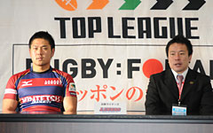 リコーブラックラムズ ![]() 神鳥裕之監督(左)、小松大祐キャプテン 神鳥裕之監督 「(19-35で敗れたファーストステージでの対戦の)リベンジをしたかったが、前半からリードを許してしまった。こちらの波に乗れなかった。(7点差以内の敗戦の)ボーナスポイント『1』を取れたことが収穫だった」 ──ファーストステージとセカンドステージの違いは? 「展開が多かったのがファーストステージで、セカンドステージは接点の争いだと思う」 小松大祐キャプテン 「前半のタックルミスが響いてしまった。次節(2014年1月5日の九州電力戦)は頑張る」 ![]() 近鉄ライナーズ ![]() 前田隆介監督(右)、森田尚希ゲームキャプテン 前田隆介監督 「勝負所でミスが多く、トライを取りきれなかった」 ──セカンドステージで変えたところは? 「特にないが、個々のディフェンスの徹底を図った」 森田尚希ゲームキャプテン 「ミスを少なくする事が、今後の課題になる」 この日、リコーブラックラムズの滝澤佳之選手が、リーグ戦100試合出場を達成 |