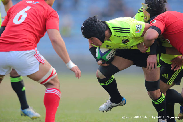 ![]() 神戸製鋼コベルコスティーラーズ 19-27 サントリーサンゴリアス プレーオフトーナメント セミファイナル ![]() ここ数年トップリーグは、サントリーサンゴリアスとパナソニック ワイルドナイツ、それに東芝ブレイブルーパスのいわゆる3強の時代と言われて久しい。このプレーオフトーナメントも、ここ数年この3強にいずれかのチームが一つ加わり、激しい闘いが繰り広げられてきた。今シーズンは、ファーストステージ・セカンドステージを通して、神戸製鋼がその3強に割り込み堂々3位通過をして、このプレーオフに2年連続出場することになった。神戸製鋼の頑張り次第では、3強時代に終止符を打てることになる。そう考えると、神戸製鋼にとってもトップリーグファンにとっても、この試合は大変意味をもつ試合になる。 天候は上々、むしろ出場している選手達には暑いくらいの気温であった。風も微風で、観客には絶好のラグビー観戦日和である。この両チームはトップリーグが始まってからは、サントリーの11勝1敗2引分けという対戦成績である。神戸製鋼が日本選手権7連覇を達成するなどサントリーの分が悪かった全国社会人ラグビー時代は今は昔、神戸製鋼にとっても復活を期した今シーズンであったのだろう。 先制は、神戸製鋼だった。7分、シーズン途中からSOとして起用されてきた正面健司が、サントリーディフェンスのギャップを突き、見事なランを見せゴール真裏に飛び込みトライを取った。神戸製鋼は、敵陣22mラインに入ると28%はトライに結び付けるというデータ通り、この試合初めての22mラインに入ってからの速攻であった。CTBクレイグ・ウイングのゴール成功(神戸製鋼7-0サントリー)。 しかし、3連覇を狙うサントリーも徐々にペースを取り戻す。この先制トライを献上しても、チーム内の動揺はほとんどなかったように見受けられた。18分、神戸製鋼SO正面健司のタッチに出したキックを直接取ったサントリーFB有賀剛がSHフーリー・デュプレアにクイックスローを行い、パスを受けた今シーズン10トライを取った新人WTB塚本健太がゴール前まで持ち込んだ。そして仕上げはこの人、FLジョージ・スミスが神戸製鋼のゴールを割った。CTBニコラス ライアンのゴール成功(神戸製鋼7-7サントリー)。 トライを奪ったジョージ・スミスは、ラックで相手ボールを奪うジャッカルであまりにも有名であるが、この試合の前半は神戸製鋼でこの日PRで先発起用された安江祥光も、ジョージ・スミスに対抗してラックでことごとくボールに絡んでいた。この両チームのブレイクダウンの攻防は、目の肥えたラグビーファンを唸らせたことであろう。 同点に追いついてからは、サントリーは本来のキックを使わず走ってつなぐラグビーを更に展開した。中でもSO小野晃征は、ディフェンスの布陣を見てパスを自由自在に放り、パスしたかと思うと次は自分で走るというのを繰り返し、大きくゲインラインを切って行った。そして30分、自らのランで敵陣22mラインに入り込み、FWがフェーズを重ねたが、最後はまた神戸製鋼のLO伊藤鐘史とWTB大橋由和のタックルを振り切り小野がトライを取った。決して相手に触らせずステップで綺麗に抜ける訳ではなく、相手にタックルされながらも抜けていくので、タックルにいった選手達はさぞ悔しかっただろう。ニコラス ライアンのゴール成功(神戸製鋼14-7)。 前半残り10分足らずになり、陣地はほぼ神戸製鋼陣内で、ボールポゼッションもサントリーが圧倒していた。しかしこの日のサントリーは、オフザゲートでのオフサイドが多く、神戸製鋼を突き放すまでは至らない。レフリーの原田隆司氏も、一貫してオフザゲートに厳しく笛を吹いていた。 そしてこのまま前半終了かと思われた39分、神戸製鋼BKがライン攻撃で大きくゲインして、22メートルラインを超える。サントリーにとっては、相手のディフェンスを見てパスに徹するCTBジャック・フーリーがいつ自ら仕掛けてくるか気が気でなかったと思われる。左右にボールを大きく振って、ジャック・フーリーは繋ぎのパスに徹し、最後は同じく南アフリカ共和国出身で今シーズンサントリー戦では初出場となる2m8cmのLOアンドリース・ベッカーが、左隅にその巨体を沈めた。タッチライン際での倒れる時の体の運び方や足の使い方が、お手本のようなトライであった。クレイグ・ウィングのゴール失敗(神戸製鋼12-14サントリー)。 ここで、前半終了。セミファイナルに相応しいスリリングなゲームになった。 後半は、両チームメンバーの入れ替えなしで始まった。後半の最初の10分は、神戸製鋼の時間だった。サントリーゴール前5mまで迫るものの、そこから取りきれない。サントリーLO真壁伸弥主将は、「ゴール前は常に意思統一して守っている」。その間の後半5分、サントリーはニコラス ライアンのPGで引き離しにかかる(神戸製鋼12-17サントリー)。 この試合は、中東とアフリカにTV中継があったと聞く。両チームの3人(フーリー・
