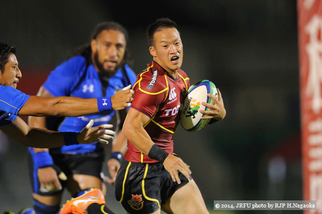 ![]() パナソニック ワイルドナイツ 26-39 東芝ブレイブルーパス ファーストステージ・第1節 プールA 開幕節の好カードに、あるいはこの春の代表チームの活躍がもたらした日本のラグビーへの期待が、この日の秩父宮ラグビー場には充満していた。その期待を引き寄せたのは、東芝ブレイブルーパスだった。昨シーズンは4度の対戦(プレーオフトーナメント準決勝含めトップリーグで3度と日本選手権決勝)全てに敗れた相手を後半圧倒し、「今日負けたら優勝はないと思っていた」(東芝・冨岡ヘッドコーチ)という開幕戦を制した。 汗でボールが滑り、例年ならハンドリングエラーが多発する開幕戦。この晩は強く吹いた風のおかげで、それ程蒸し暑さは感じられなかった。前半その強風を背中に受けていたのは東芝だったが、昨シーズンの王者パナソニック ワイルドナイツのディフェンスは、東芝FWのモールドライブ、ボールキャリーを断固許さなかった。パナソニックはブレイクダウンからのSH田中史朗のフラットなパスに走り込んで来るランナー達が、東芝ディフェンスに少しずつ食い込んで行く。後退した東芝が犯した反則で2分にSOベリック・バーンズがPGを決めた後の11分には、ゴール前PKから田中が速攻。昨シーズンはインパクトプレーヤーとして途中出場が多かったが、今シーズンは13番を着ているJP・ピーターセンが先制トライ(ゴールはバーンズ)をあげ、10-0と試合の入りはパナソニック優位。 パナソニックは東芝のキックで自陣深くに下げられても、ワイドに展開したり、ショートサイドを攻めたりと、テンポよくボールを繋いでチャンスを作り出して行く。今シーズンから監督に就任した名将ロビー・ディーンズの母国=ニュージーランド代表のような魅力的なアタックだったが、その後2つ目のトライは、実に試合終了間際まで待たねばならなかった。 東芝は14分過ぎ、敵陣でのスクラムからSO廣瀬俊朗のパスに鋭角に走り込んだCTB仙波智裕がラインブレイクしてトライ寸前まで迫り、盛り返す。ここで得たPKを攻め急がず、確実にSH小川高廣が3点を返してチームを落ち着かせると、19分には得意のラインアウトモールからこの日ゲームキャプテンのWTB大島脩平が右隅にグラウンディング。今シーズンから採用されたテレビジョンマッチオフィシャルにより初のトライが認められた。小川が難しいゴールも決めて10-10の五分とする。 「10点先行されたことに焦りは感じなかった」(大島ゲームキャプテン)という東芝は、立ち上りのパナソニックの攻勢に対し、PGを交えてすぐに追い付いたことが大きかった。前半30分以降は逆に東芝が攻勢に出て、巧みなターンでラインブレイクしたFB夏井大輔がゴール前まで持ち込むと、ラックからPR浅原拓真が2つ目のトライ(小川のゴール)で逆転して前半を折り返した。 パナソニックが風上となる後半、前半ほどには風が強くなくなっていた。試合後ディーンズ監督が「前半のようなプレッシャーをかけ続ける事ができず、それを開放してしまった」と話した後半は、逆に東芝がパナソニックにプレッシャーをかけていった。15分にはラインアウトモールからFLスティーブン・ベイツが象徴的なトライをあげ、驚きと歓喜が入り混じった歓声でスタンドも盛り上がる。さらに20分には、この日マン・オブ・ザ・マッチに輝いた小川がラックから少し離れた位置を鮮やかなパスダミーで鋭く抜け出し、そのままインゴールへ飛び込むと、スタンドのボルテージは最高潮に達した。終盤にもパナソニックのパスをカットして繋いだ後、途中出場のPR森太志が見事なステップで5つ目となるトライをあげてダメを押した。自らの初陣を飾った冨岡HCは、「試合中もインカムを通して<エナジー、エナジー>と言い続けた」と、メンタル面の充実を勝因にあげていた。 一方敗れたパナソニック。後半は反則も多くなり、バーンズの1PGと終了のホーンが鳴った後のCTB林泰基のトライ(バーンズのゴール)だけに抑えられてしまった。「勝ちたい気持ちが東芝より少し足りなかった」と話したHO堀江翔太主将は、スクラムでも相手にプレッシャーをかけられていた事を認めた。「今日の(東芝が気持ちを前面に出してかかってくるはずだという)結果は予測していた」というディーンズ監督だが、「プレシーズンからステップアップしている。これからもよくなって行く」と、シーズンを通じてチャレンジしていく気持ちを強調していた。(米田) ![]() ● 記者会見ダイジェスト ●