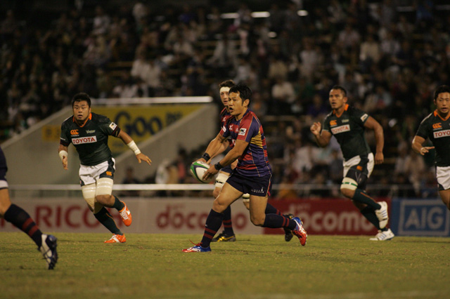 ![]() ファーストステージ・第5節 プールB 秋の虫の声が響き渡る静かな夜、近鉄のキックオフで試合開始。お互いに序盤からボールを積極的に動かす中、先制したのは近鉄。7分にPGでこの試合最初の得点をあげる。その後、12分にこぼれ球をトヨタ自動車14番 彦坂(匡)が拾い上げて独走トライをあげ逆転するが、近鉄の速いリズムの連続攻撃が一際目立つ。それが17分の近鉄のトライにつながるが、それに対するトヨタ自動車はチャンスに確実に得点をあげるラグビーで25分にPKからトライとゴール。33分にPGで得点を重ね、7点のリードで前半終了間際を迎える。このまま前半終了と思われた38分、近鉄がラインアウトのこぼれ球から攻撃を継続しトライをあげ、17-17の同点で前半終了。 後半は、トヨタ自動車が開始から積極的に攻撃を仕掛けるも近鉄が激しいディフェンスで前進を許さない。その勢いのまま、4分にPG、9分にトライとゴールを加え、突き放しにかかる。しかしトヨタ自動車も15分、相手のノックオンのアドバンテージを有効に使ってトライを返し反撃開始かと思われたが近鉄の勢いはとどまるところを知らなかった。 ![]() ● 記者会見ダイジェスト ●