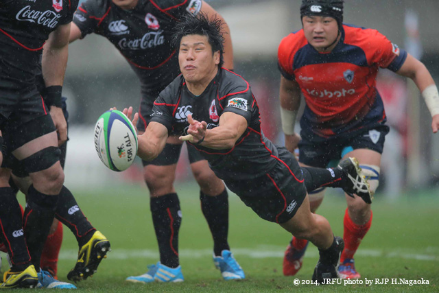 セカンドステージ・第1節 グループB 肌寒い雨が降る秩父宮ラグビー場の第1試合はファーストステージ プールA3勝3敗1分で5位のクボタスピアーズと、プールB1勝6敗で7位のコカ・コーラレッドスパークスとの一戦。 前半はクボタのキックオフで試合が始まった。 前半は雨の中で両チームとも攻守に精彩を欠いていた。後半戦どう立て直していくかが見ものである。 6分、クボタがラックからライン攻撃で左へ回して11番WTB 田中がこの試合の初トライをあげた。12番CTB立川が左隅30mの難しいゴールを決めて逆転した。 15分、コカ・コーラのオーバーザトップのペナルティで12番CTB立川が中央30mのPGを決めて10-3。 24分、コカ・コーラのオフサイドに12番CTB立川が中央22m PGを決めて13-3。 33分、クボタがゴール前でラックサイドをしつこくついて右隅に18番PRタキタキがトライをあげて突き放す。18-3。 39分、コカ・コーラ15番FB吉澤が右隅へ走り込んでトライを上げて一矢報いた。18-8。 マン・オブ・ザ・マッチは雨で大味な試合になった中でも攻守の要として光っていたクボタスピアーズ12番CTBの立川理道だった。 次節はクボタスピアーズが12月7日(日)11:40~名古屋市瑞穂公園ラグビー場で豊田自動織機シャトルズと、コカ・コーラレッドスパークスは12月7日(日)13:00~滋賀・皇子山総合運動公園陸上競技場でNTTドコモレッドハリケーンズと対戦する。 ![]() ![]() ● 記者会見ダイジェスト ●