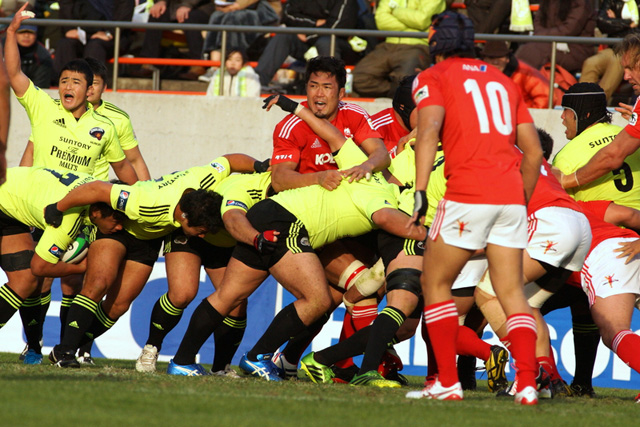 神戸製鋼コベルコスティーラーズ 20-10 サントリーサンゴリアス セカンドステージ・第2節 グループA ジャパンラグビー トップリーグ2014-2015/セカンドステージ第2節。第1節で自慢のFWにほころびが生じ、東芝ブレイブルーパスに苦杯を嘗めさせられた神戸製鋼コベルコスティーラーズとヤマハ発動機ジュビロに勝利したサントリーとの一戦、ファーストステージでは神戸製鋼がFW・BKが一体となった怒涛の攻めでサントリーDFを切り裂き、29-22で全勝対決を制している。12月に入り一気に冷え込みが厳しくなった中、近鉄花園ラグビー場に駆けつけた6,000人近い熱心なファンの前で、トップリーグ屈指の好カードはサントリーCTB小野晃征のキックオフで開始された。 実力伯仲した両チームだけあって、お互い強固なディフェンスを前面になかなか相手に攻撃の糸口を掴ませない。神戸製鋼はスクラム、サントリーはタックルで相手のチャンスを一蹴する場面が続く。そんな中、均衡を破ったのはサントリー。前半22分に相手のオーバー・ザ・トップで得たゴール前25m右中間のPGを小野が決めて0-3と先制した。一方の神戸製鋼も直後の26分、ゴール前で攻めあぐねているところを、SO正面健司が22mライン付近左中間からDGを決めて、すぐさま3-3の同点に追いついた。さらに神戸製鋼は前半終了のホーンの後、サントリーのスクラム・コラプシングで得たゴール正面のPGをCTB山中亮平が難なく決め、6-3とこの試合初めて神戸製鋼がリードして前半を終えた。 後半も先に得点したのはサントリー。後半14分、神戸製鋼No.8谷口到のハイタックルによるシンビンの直後、ゴール前10mのラインアウトモールからFL佐々木隆道が抜け出して左中間にトライ、小野のゴールも決まり6-10と再逆転した。しかしこの日の神戸製鋼はここから粘り腰をみせる。ゴール前ラインアウトからFWラッシュを繰り返し、28分にゴール直前右中間ラックから出たボールをLOアンドリース・ベッカーが押込み、右中間に長いリーチを伸ばして押さえた。グラウンディングに関するTMOの結果、ベッカーのトライは成立、山中のゴールも決まって13-10と再逆転に成功した。 しかし、ここからわずか3点差を巡って両チームの意地のぶつかり合い。34分には両チームからシンビンプレーヤーが出るなどやや荒れ模様の展開の中の37分、ハーフウェイライン付近で相手パスをインターセプトした神戸製鋼CTBクレイグ・ウィングが50mを走り抜きポスト左にトライ、20-10と熱戦に終止符をうった。 サントリーは特に前半、スクラムで神戸製鋼に圧倒され、FWが本来の動きを封じられ満足に得点できなかったことが痛い。一方の神戸製鋼もサントリーのディフェンス網に苦しめられ思うようなゲーム展開とはならなかったが、13-10と逆転した直後の後半30分、自陣ゴール前でのサントリーのラインアウトをベッカーがスティールするなどここ一番での集中したディフェンスでサントリーのチャンスの芽を摘んだことも大きな勝因である。 ![]() ● 記者会見ダイジェスト ●