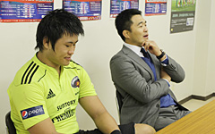サントリーサンゴリアス ![]() 大久保監督(右)、真壁キャプテン 大久保直弥監督 「本日はありがとうございました。結果は残念なことは勿論のこと、見に来ていただいた方にラグビーのおもしろさが伝わったのかという点では、自分たちにとっては恥ずかしい内容の試合だった。これから試合は続いていくので、これを次のエネルギーに変えなければいけない。引き続きチーム一丸となってもう一度、やはり自分たちのラグビーがどういうものなのかを部員一人一人に説いていきたいと思う」 ──今シーズン2回目の対戦、本日のテーマは? 「キックが多い相手なので、ラインアウトとキックを受けてからのアタックでいかにボールを繋いでいくかがテーマだったが、ラインアウトの獲得は良くなかった。また、スクラムが多かったので思ったようなゲーム展開(速いテンポ)にもっていけなかったのが一番の敗因だ。相手が疲れないままゲームが終わってしまった。セカンドステージに入って、スクラムとラインアウトの割合がかなりゲームの優劣を占めている。来週の東芝戦もキーになると思うので対策は考えたい」 真壁伸弥キャプテン 「本日のテーマはリベンジだったが、なかなか自分たちのラグビーができず、最初からつまらないミスが多くそのまま神戸製鋼のペースに持っていかれました。しっかり修正して、来週からまた頑張っていきたい」 ![]() 神戸製鋼コベルコスティーラーズ ![]() ゴールド ヘッドコーチ(左)、橋本キャプテン ギャリー・ゴールド ヘッドコーチ 「想定していた通り非常にタフな試合でした。サントリーはアタックが強いので、ディフェンスが試される試合だったが、選手はハードに仕事をしてくれた。特に、前半は圧倒的にスクラム・モールを支配していたにも関わらず得点につながらなかったが、そこを我慢して後半に逆転したことは意味があると思う」 ──マン・オブ・ザ・マッチのベッカー選手の評価は? 「パフォーマンスに関して言えば、スプリングボクスの時期も含めて間違いなくベストのパフォーマンスの一つをしていると思う。体調管理も万全だし、日本のラグビーを愛しているし、チームにとって大切な選手だ。今日の試合でもラスト5分のラインアウトのボールスチールは、チームの勝利には決定的な仕事をしてくれたと思う」 橋本大輝キャプテン 「前半は自分たちのプレーができたにも関わらずあまり得点を重ねることができず苦しんだが、後半の中盤で離されかけたときにハードワークができたことが、最後に勝つことにつながったと思います」 ──どのようなゲーム展開を目指していたか? 「最初は模索していたが、セットプレーが安定していたので、そこを中心にゲームを組み立てた」 ![]() ![]() ![]() ![]() ![]() ![]() ![]() マン・オブ・ザ・マッチは神戸製鋼コベルコスティーラーズ5番、アンドリース・ベッカー選手(記事:石川悟、蜷川善夫、高橋茂治 写真:野口美保 広報担当:村島博) |