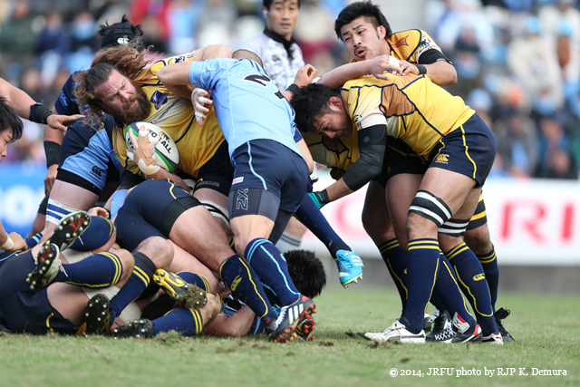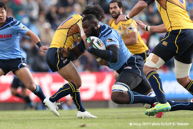 ![]() ヤマハ発動機ジュビロ 26-9 NTTコミュニケーションズシャイニングアークス セカンドステージ・第3節 グループA ヤマハジュビロ、ファーストステージのリベンジをホームで晴らす ファーストステージのリベンジに燃えるヤマハ発動機(以下ヤマハ)と上位グループ初勝利を狙うNTTコミュニケーションズ(以下NTTコム)の一戦が、寒波到来で気温が低く強風のヤマハスタジアムで行われた。 ヤマハのキックオフで試合開始。前半5分、NTTコムのホールディングでつかんだ22mL付近左のPGのチャンスを15番FB五郎丸が決めヤマハが先制。立ち上がりは両チームとも動きが硬かった。ヤマハはいい形で相手陣深く攻め込むも、2度ターンオーバーでチャンスを潰しトライまではいかずに時間が過ぎた。 その後も両チーム攻撃のリズムをつかめない中、前半21分、ヤマハのノットロールアウェイによるPGをNTTコム10番SOエルトン・ヤンチースが決め3点を返す。さらに、エルトン・ヤンチースは、28分にもヤマハのディフェンスの隙を突き、風上ではあるがゴール正面30mのロングDGを決め同点に追いつく。 後半に入り最初にチャンスをつかんだのはNTTコム。3分、ヤマハがハンドを犯し、NTTコム10番SOエルトン・ヤンチースにPGを決められる。 前半少なかったスクラムで、ヤマハが相手に徐々にプレッシャーをかけ相手のミスを誘う。NTTコムも強風の中ハイパントなどで活路を見出そうと試みる。 この日のマン・オブ・ザ・マッチは、攻守に素晴らしい動きを見せ、ヤマハのスクラムをリードした2番HO日野剛志が受賞した。 ![]() ● 記者会見ダイジェスト ●