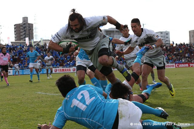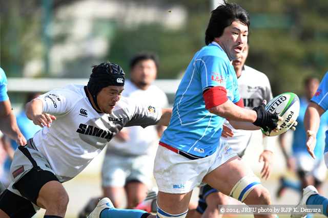 セカンドステージ・第4節 グループB 暖かい日差しが降り注ぎ、強い風の残る冬晴れの中、宗像サニックスブルースのキックオフで試合開始。立ち上がり、サニックスはゴール前まで攻め込み、ラインアウトモールで前進を試みるもミスでトライは奪えなかった。 その後のキックオフから豊田自動織機が展開し、サニックス陣でゲームを進め、前半30分、豊田自動織機がPGで3点を加え、10-0とする。 後半に入り、2分に豊田自動織機が9番 梅田のトライで先制する。 すると、後半19分、豊田自動織機はペナルティからラインアウトモールで4番 岡崎がトライ、ゴール成功で36-7となる。 (この他の写真については、関西協会ウェブサイトでご覧いただけます)