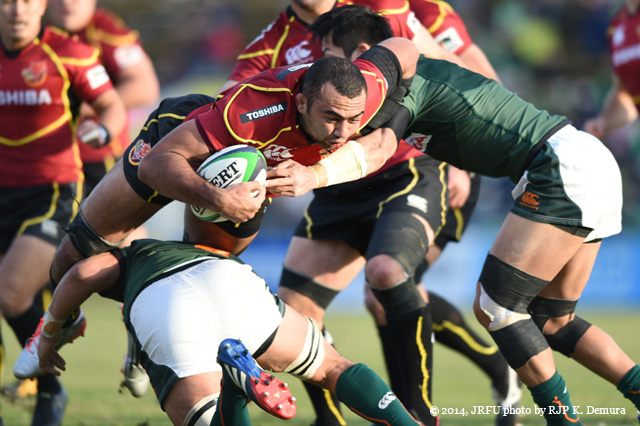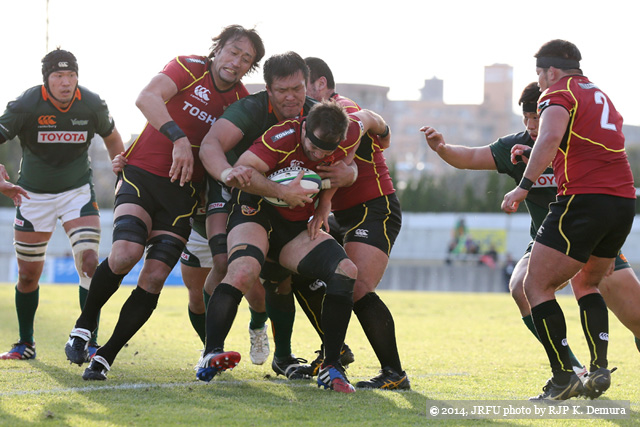 トヨタ自動車ヴェルブリッツ 29-44 東芝ブレイブルーパス セカンドステージ・第4節 グループA 午後になり、気温も上昇し、前日の寒さを忘れるような気候の中、東芝ブレイブルーパスのキックオフからスタート、前半7分まではお互いに激しい体の当て合いが続きこう着状態。 その後はトヨタの攻撃が継続するも、反則からチャンスを失っていたが、後半30分、BKのアタックから、速いテンポでボールを動かし、15番 竹田が右隅にトライ、ゴールは失敗したが12-10とヴェルブリッツが再び逆転。 後半スタート直後、風下の東芝が必死に自陣から脱出しようとするも、うまく脱出できず、トヨタが逆にチャンスを活かし、2分に12番 マッキンタイアーがトライ、ゴールも成功させ26-13と東芝を突き放した。 後半17分、トヨタも東芝の反則からPGを選択し、成功させ29-27と再び逆転するも、東芝の勢いは止まらず、トヨタは苦しくなり、後半22分反則をする。 (この他の写真については、関西協会ウェブサイトでご覧いただけます)