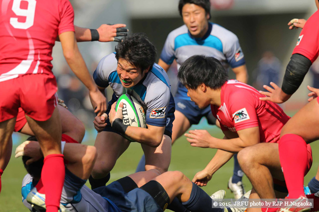 ![]() NTTドコモレッドハリケーンズ 42-15 クボタスピアーズ セカンドステージ・第6節 グループB セカンドステージも残すところあと2節となったトップリーグ2014-2015第6節グループB、前節まで3位のクボタと5位のNTTドコモとの一戦。前節ではともに上位チームに敗れて2敗となった両チームだが、勝点ではわずかにクボタがNTTドコモをリードしている。熾烈なワイルドカード争いに生き残りを賭ける両チームの戦いはファーストステージでは対戦がなく、年が明けてようやく今シーズン初の顔合わせ。新春のヤンマースタジアムの4,000人を超す熱心なラグビーファンの前、クボタSO森脇秀幸のキックオフで開始された。 先制したのはクボタ。前半2分にゴール前10mの右ラインアウトモールを押し込んで一気にゴールラインに迫ったクボタのグラウンディング間近に、耐え切れずNTTドコモが犯したモールコラプシングに対して、前田レフリーは即座にペナルティ・トライの判定。あっさりクボタが先制トライを奪い、CTB立川理道のゴールも決まり0-7とした。 一方クボタも18分、NTTドコモのラインオフサイドで得たゴール前10m中央のPGを再び立川が難なく決め、10-10と同点に追いつく。この日の両チームはお互いに積極的な攻撃を繰り返し、22分にNTTドコモがFW攻撃で、32分にクボタがBK展開でトライを挙げ、前半終了間際の40分にはNTTドコモ才口がPGを決めて、20-15とNTTドコモがわずかにリードして前半を終えた。 ところが後半に入ると前半と大きく異なりNTTドコモの一方的なペース。開始直後の2分、ゴール前20m中央ラックより右に展開し、BKの巧みなパス回しで最後はSOリアン・フィルヨーンが右中間に押さえて25-15と得点差を拡げた。その後も28分、33分にSH辻埜拓也、No.8イオンギ譲のトライで39-15とし、クボタに引導を渡した。仕上げは38分、NTTドコモCTBパエアミフィポセチが10mL中央からDGを決めてダメ押し、42-15と立ち上がりの接戦から一転した結果となった。 この日のクボタはBK陣にキレがなく有効な展開ができなかった。一方のNTTドコモはフィルヨーンの効果的なキックでエリアを確保し、さらにBKが積極的にオープンに展開、フェーズを繰り返して生じたクボタの穴を突くことで着実に加点した。 ![]() ● 記者会見ダイジェスト ●