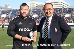セカンドステージ・第6節 グループB セカンドステージは年を越して第6節を迎え、共に4勝1敗(総勝点:23)で並ぶグループB首位争いとなったこの試合。 NECはキックオフ直後からNo.8 ニリ・ラトゥのライン参加を起点とし、連続攻撃でリコーブラックラムズ陣へ攻め込んで行く。 対するリコーは前半11分、相手反則によるPKのチャンスから、FBピータース・ダニエルがハーフウェイライン付近からPGを狙うも不成功で同点のチャンスを逃すが、直後の13分、ブレイクダウンの連続攻撃からNEC陣へ攻め込むと、ゴール前中央付近でNECがノットリリースザボールの反則、これをFBピータースがPGを決め同点とする。(3-3) NECも16分、相手陣10m付近でペナルティーのチャンスを得るが、SOウェブ のPGは不成功。 34分、チャンスを掴んだのはリコー。相手陣ゴール前右5m付近のラインアウトからモールで押し込み、崩れたモールの左サイドをHO滝澤佳之が相手ディフェンスのスペースをうまくかわし右中間にトライ、FBピータースのゴールも成功し(10-3)とする。 後半はリコーのキックオフでスタート。 試合が動いたのは後半33分、自陣22m中央付近でNECが痛恨の反則(オーバーザトップ)、これをFBピータースがPGを慎重に決め、後半両チーム初得点となる貴重な追加点を挙げる。(13-3) この結果、リコーブラックラムズは勝点4を獲得(総勝点27)し、ワイルドカードトーナメント出場を決めた。 尚、マン・オブ・ザ・マッチは、この試合で唯一のトライを挙げた、リコーブラックラムズ(HO)滝澤佳之選手が選ばれた。 また、この試合で、谷口かずひと(A1級)レフリーが、トップリーグ リーグ戦(レフリー担当)通算100試合達成。(リーグ戦 レフリー初担当試合も12年前のNEC vs リコー戦) ![]() ![]() ● 記者会見ダイジェスト ●