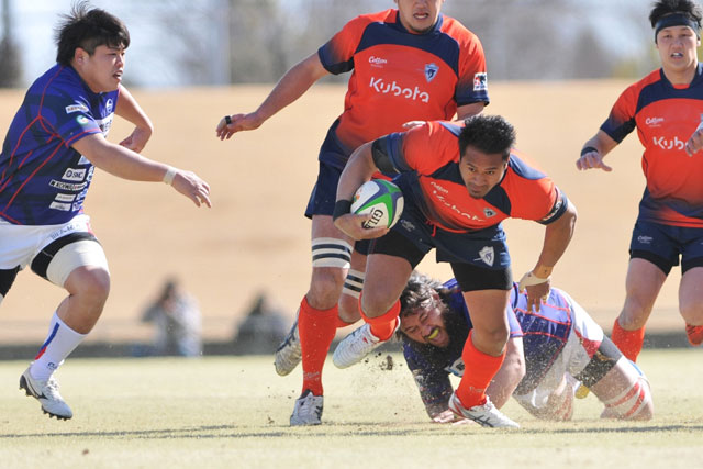 ![]() トップリーグ入替戦 トップリーグ13位のクボタスピアーズとトップチャレンジ1 4位の釜石シーウェイブスの入替戦。天気は快晴も風が強く舞う。メインスタンドから見て左から右に向けて巻き込んでいる。時折弱まるも角度を変えて強く巻き込む風もこの試合の演出者の1人だった。 前半は風上に釜石、風下にクボタが陣地を取り、クボタのキックオフで試合が始まる。前半3分、釜石のコラプシングで得たペナルティでクボタはショットを選択。正面からのPGをクボタ12番立川理道が決め3-0。続く前半5分には密集戦から抜け出したプレーがTMO判定となり、クボタ7番フィナウ・フィリペサーリのトライと認められ8-0。 前半9分にはクボタ陣内22mライン付近のラインアウトからフェーズを重ね、釜石15番沼田邦光がトライを決めて8-5と追い上げる。しかし、このプレーで沼田は負傷交替となってしまった。 前半27分クボタ23番柴原英孝が自陣から大きくゲインし、カウンターアタックを仕掛け、サポートに付いたクボタ5番今野達朗がトライを決めて13-5と再び突き放しにかかる。 後半はサイドが代わり、風上にクボタ、風下に釜石となった。風上に立ちキックの飛距離が伸びるようになったクボタは後半6分に釜石のオーバーザトップのペナルティで得たPGをクボタ12番立川理道が決めて16-5。後半17分、後半25分と12番立川理道がPGを決めて19-5、22-5と着実にクボタは点差を広げていった。 後半29分風上を生かし釜石陣内に深く攻め込んだクボタはモールを押し込み20番キーガン・ダニエルがトライ。27-5とする。試合終盤の後半34分クボタ11番鈴木貴士がスピードに乗り釜石のディフェンスを抜き去りゴール中央へトライ。12番立川理道のゴールも決まり34-5とした。釜石も一矢報いようと果敢に攻めこんだが、後半無得点で試合終了。 ![]() ● 記者会見ダイジェスト ●