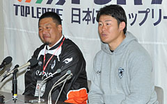 釜石シーウェイブスRFC ![]() 三浦ヘッドコーチ(左)、須田キャプテン 三浦健博ヘッドコーチ 「初の入替戦に出場し、新しい歴史を作ろうとゲームをした。今年一年間やってきた事を皆、プレーで見せてくれたと思います。トップリーグチームのクボタさんのゲーム運びやキックの精度の部分でプレッシャーを受けたのかなというゲームだった。選手は良く頑張ってくれた」 須田康夫キャプテン 「新しい歴史を作ろうと臨んだが、トップリーグを経験されたクボタさんの試合巧者ぶりと言うか、ゲームの中での精度に差が出たのかと思います。コンタクトエリアでは、しっかりやれる自信は付いたので、来年から一からまたやり直していきたい」 ──風が強かったが、どういうゲームプランを立てて、どれだけできたか? 三浦ヘッドコーチ 「前半トスを取ったら、風上でと決めていた。ショットとか入っていれば、クボタさんにもプレッシャーをかけられると考えた。クボタさんが風下の時ペナルティからクイックで攻撃してきたが、それを想定してなかったのはミスだった」 ──沼田選手の(負傷)交替によるプランの影響は? 三浦ヘッドコーチ 「予期せぬ怪我になり、メンバー入替のプランが狂った。風下になれば、どんどんボールをキープしなければならなかったが、替えるタイミングが難しかった」 ──伊藤剛臣選手の欠場の事情と影響は? >三浦ヘッドコーチ 「練習中の怪我で出場できなかった。代わりに出た選手も頑張ってくれたので、そんなに大きな影響はなかったと思います」 ──今季を振り返って。 三浦ヘッドコーチ 「トップチャレンジ出場を目標に頑張ってきて、何とか目標は達成できた。力は付いてきたので、来季は安定した力を出せればと思います」 須田キャプテン 「長いシーズンだったが、チームとしては成長できた一年だった」 ──チームカラーを出せた部分と、トップリーグの壁は? 三浦ヘッドコーチ 「ラックエリアでのコンタクトでは勝てた部分もあったが、ラックに入り過ぎて、オーバーラップされた部分もあったので修正していきます」 須田キャプテン 「一昨年対戦した時は、セットプレーやコンタクトでも全然通用しなかったが、今日はセットプレーを余裕を持ってできたし、それ程プレッシャーを感じずに進める事ができました。クボタさんがショットを狙ってきたのも、プレッシャーを掛ける事ができたと思うので、そういう結果になったのかな? と感じました」 ──トップリーグに上がるために必要なものは? 須田キャプテン 「もっと執着心を持って出していけば、届かない距離ではないと感じてます」 ──応援の力を感じてますか? 須田キャプテン 「どの会場でも、たくさんの釜石ファンの皆様が来て下さってるのも凄く感じるし、試合中も僕達の時間帯の時に、しっかりと釜石の、時間にしてくれていて、力になってると感じます」 ──シーズンを終えて。 三浦ヘッドコーチ 「トップチャレンジに出場する力は持っている。選手もチームも大きく成長した一年だと思います。力を常に平均的に出せるようになれば、トップリーグに近づけると思います」 須田キャプテン 「長くシーズンを過ごせたのは良かった。力は出し切ったので、今は休みたい」 ──岩手から応援に来てくださった方々に一言。 三浦ヘッドコーチ 「遠くから応援に来てくれて、ありがとうございます。健闘した釜石だけでなく、勝つ釜石を見せたいので、また足を運んでもらえる様に頑張ります」 須田キャプテン 「いつも釜石シーウェイブスを応援して頂いてるので、良い結果として恩返しをしたかったが叶わなかった。来年もチャレンジしたいので、変わらぬ声援をお願い致します」 ![]() クボタスピアーズ ![]() 石倉監督(左)、今野ゲームキャプテン 石倉俊二監督 「勝ってトップリーグに残留できた事は良かったと思います。前半、釜石さん全体の勢いに押されてしまいました。ハーフタイムの状況を見ると、選手達は冷静で、後半に入って最初から集中して、敵陣に入って取りにいこうと声が出てたので、ハーフタイムの時は安心してました。一年を通してセットプレーや簡単なミスが多かったのが今後の反省だが、今日の試合でも出てしまったと感じてます。トップリーグに残留できたので、来シーズンに向けて、明日から修正して上位を目指したい。上との差は紙一重だと思ってます。ただ、どこで力を出していけば勝てるのか、もう一度選手達と取り組んでいきたい」 今野達朗ゲームキャプテン 「相手がどこであっても、結果が勝ったという事で良かったと思います。来年はもっと上位に食い込みたいと思います」 ── グランドレベルでの風の影響は? 今野ゲームキャプテン 「すべてのプレーがやり辛かった。声が聞き辛かったし、ハイキックだけでなくパスの軌道も変わって難しかった。結果としてブレイクダウン回りでノックオンとかが起きてしまいました」 ── 後半、ショットを重ねた事は