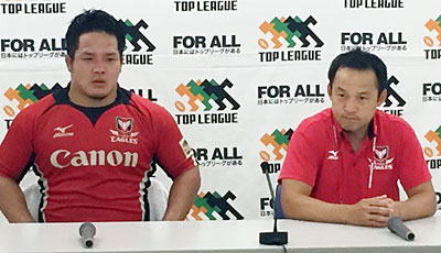 キヤノンイーグルスの永友監督(右)、庭井キャプテン