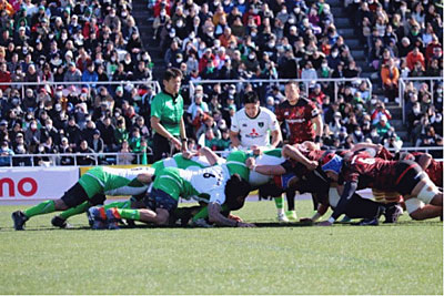 3分、三菱重工がPKで東芝ゴール前のラインアウトから7番小林がブラインドサイドを駆け抜けて左中間へトライ。15番青木のゴール成功で26対19とする。