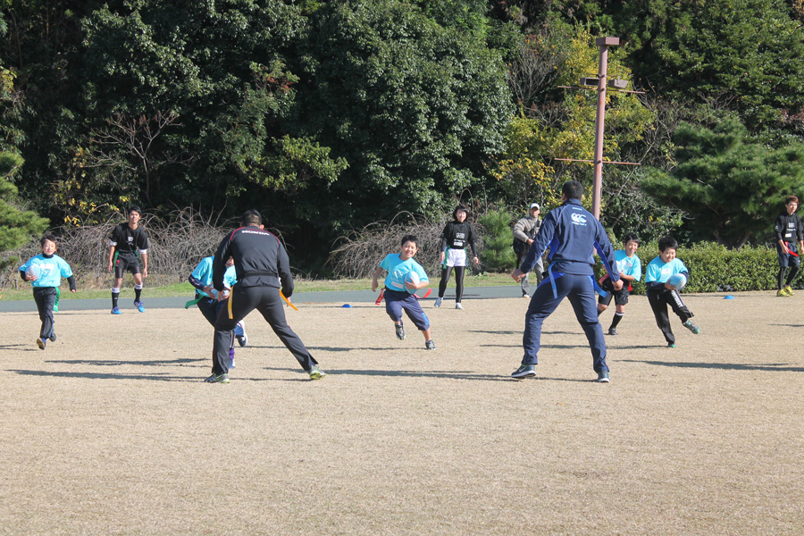 2015年11月28日(土)エコパスタジアムにてタグラグビー教室が開催されました。ゲストコーチとして、元日本代表の大畑大介さん、齊藤祐也さん、そしてトップリーグ、Honda HEATから北川忠資選手が、ヤマハ発動機ジュビロから西村颯平選手、藤井達也選手、松本力哉選手が参加してくださり、たくさんの小学生にタグラグビーの楽しさを教えてくださいました。