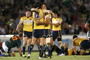 前半2分にSO君島良夫、FBブラッキン・カラウリアヘンリー、WTB小泉将のラインブレイクからCTBマット・サンダーズのトライで先制。